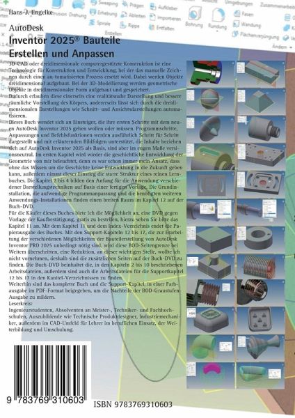 Inventor 2025® Bauteile Erstellen und Anpassen 3D-CAD oder dreidimensionale computergestützte Konstruktion ist eine Technologie für Konstruktion und Entwicklung, bei der das manuelle Zeichnen durch einen au-tomatisierten Prozess ersetzt wird. Dabei werden Objekte dreidimensional aufgebaut. Bei der 3D-Modellierung werden geometrische Objekte in dreidimensionaler Form aufgebaut und gespeichert. Dadurch erlauben diese einerseits eine realitätsnahe Darstellung und bessere räumliche Vorstellung des Körpers, andererseits lässt sich durch die dreidimensionalen Darstellungen wie Schnitt- und Ansichtsdarstellungen automatisieren. Dieses Buch wendet sich an Einsteiger, die ihre ersten Schritte mit dem neuen AutoDesk Inventor 2025 gehen wollen oder müssen. Programmschritte, Anpassungen und Befehlsfunktionen werden ausführlich Schritt für Schritt dargestellt und mit erläuternden Bildfolgen unterstützt, die Inhalte beziehen sich auf AutoDesk Inventor 2025 als Basis, sind aber im engen Maße versionsneutral. Im ersten Kapitel wird wieder die geschichtliche Entwicklung der Geometrie von mir beleuchtet, denn es war schon immer mein Ansatz, dass ohne das Wissen um die Geschichte keine Entwicklung in die Zukunft geben kann, außerdem nimmt dieser Einstieg die starre Struktur eines reinen Lernbuches. Die Kapitel 2 bis 4 bilden den Anfang für die Anwendung verschiedener Darstellungstechniken auf Basis einer fertigen Vorlage. Die Grundinstallation, die aufwendige Programmanpassung und die benötigten weiteren Anwendungs-Installationen finden einen breiten Raum im Kapitel 12 auf der Buch-DVD. Für die Käufer dieses Buches biete ich die Möglichkeit an, eine DVD gegen Vorlage der Kaufbestätigung, gratis zu bestellen, hierzu sehen Sie bitte das Kapitel 11 an. Mit dem Kapitel 11 und dem Index-Verzeichnis endet die Papierausgabe des Buches. Mit den Support-Kapiteln 12 bis 17, die zur Erarbeitung der Bauteilerstellung von AutoDesk Inventor PRO 2025 unbedingt nötig sind, wird diese BOD-Seitengrenze bei Weitem überschritten, deshalb sind die zusätzlichen Seiten auf der Buch-DVD zu finden. Die Buch-DVD beinhaltet die, in den Kapiteln 2 bis 10 beschriebenen Arbeitsdateien, außerdem sind auch die Arbeitsdateien für die Supportkapitel 12 bis 17 in den Kapitel-Verzeichnissen zu finden, weiterhin sind das komplette Buch und die Support-Kapitel, in einer Farbausgabe im PDF-Format beigegeben, um die Nachteile der BOD-Graustufen-Ausgabe zu mildern.