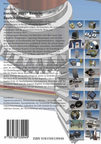 Hans-J. Engelke AutoDesk Inventor 2025 Bauteile Bauteil-Montage Dieses Buch stellt eine Sammlung von Bauteil-Montagen-Anwendungen, in Bezug auf erstellte Bauteile, dar. Die beiden Anfangskapitel zeigen, im Einzelnen, die technischen Grundlagen und die programmtechnische Basis von AUTODESK INVENTOR 2025. Die Baugruppen-Montage von Bauteilen wird über starre und bewegliche-Baugruppen, Lagerungs-Baugruppen und Getriebe-Baugruppen in Einzelkapiteln mit Programmschritten, Anpassungen und Befehlsfunktionen ausführlich Schritt für Schritt dargestellt und mit erläuternden Bildfolgen unterstützt, abschließend wird im Abschluss-Kapitel 15 ein Einstieg in die Erstellung von Bewegungsstudien dargestellt. Die Inhalte beziehen sich auf AutoDesk Inventor 2025 als Basis, sind aber im engen Maße versionsneutral. Die Grundinstallation, die aufwendige Programmanpassung und die benötigten weiteren Anwendungs-Installationen finden einen breiten Raum im Kapitel 8 und 9 auf der Buch-DVD, weiterhin zeigt das Kapitel 10, ebenfalls auf der Buch-DVD, die Anwendung verschiedener Darstellungstechniken auf Basis einer fertigen Vorlage. Für die Käufer dieses Buches biete ich die Möglichkeit an, eine DVD gegen Vorlage der Kaufbestätigung, gratis zu bestellen. Die Buch-DVD beinhaltet die, in den Kapiteln 2 bis 6 und Supportkapitel 8 bis 15, beschriebenen Arbeitsdateien. Weiterhin sind das komplette Buch und die Support-Kapitel, in einer Farbausgabe im PDF-Format beigegeben, um die Nachteile der Graustufen-Ausgabe zu mildern.
