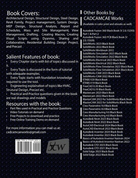 The Autodesk Revit 2024 Black Book is the 5th edition of our series on Autodesk Revit. This book is designed to help beginners in understanding the workflow in Revit and how simple BIM models are created. The book follows a step-by-step methodology. In this book, we have tried to give real-world examples with real challenges in designing. We have tried to reduce the gap between educational use of Autodesk Revit and industrial use of Autodesk Revit. The book covers almost all the information required by a beginner to master Autodesk Revit. The book covers Architectural Design, Structural Design, Project Management, Revit Family Components, MEP, Mass and Site Creation, Drafting, Data Management and Collaboration, Macros, Visual Scripting, and Precast. A residential building project is given in this book which revises major topics discussed throughout the book. Some of the salient features of this book are: In-Depth explanation of concepts Every new topic of this book starts with the explanation of the basic concepts. In this way, the user becomes capable of relating the things with real world. Topics Covered Every chapter starts with a list of topics being covered in that chapter. In this way, the user can easily find the topic of his/her interest easily. Instruction through illustration The instructions to perform any action are provided by maximum number of illustrations so that the user can perform the actions discussed in the book easily and effectively. There are about 1080 small and large illustrations that make the learning process effective. Tutorial point of view At the end of concept's explanation, the tutorial makes the understanding of user firm and long lasting. Major topics of the book have tutorials that are real world projects. Also, most of the tools in this book are discussed in the form of tutorials. For Faculty If you are a faculty member, then you can ask for video tutorials on any of the topic, exercise, tutorial, or concept. As faculty, you can register on our website to get electronic desk copies of our latest books, self-assessment, and solution of practical. Faculty resources are available in the Faculty Member page of our website once you login. Note that faculty registration approval is manual and it may take two days for approval before you can access the faculty website.