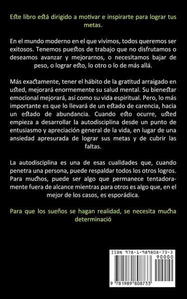 Este libro está dirigido a motivar e inspirarte para lograr tus metas. En el mundo moderno en el que vivimos, todos queremos ser exitosos. Tenemos puestos de trabajo que no disfrutamos o deseamos avanzar y mejorarnos, o necesitamos bajar de peso, o lograr esto, lo otro o lo de más allá. Más exactamente, tener el hábito de la gratitud arraigado en usted, mejorará enormemente su salud mental. Su bienestar emocional mejorará, así como su vida espiritual. Pero, lo más importante es que lo llevará de un estado de carencia, hacia un estado de abundancia. Cuando esto ocurre, usted empieza a desarrollar la autodisciplina desde un punto de entusiasmo y apreciación general de la vida, en lugar de una ansiedad apresurada de lograr sus metas y de cubrir las faltas. La autodisciplina es una de esas cualidades que, cuando penetra una persona, puede respaldar todos los otros logros. Para muchos, puede ser algo que permanece tentadoramente fuera de alcance mientras para otros es algo que, en el mejor de los casos, es esporádica. Para que los sueños se hagan realidad, se necesita mucha determinació