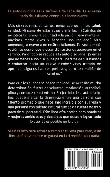La autodisciplina es la sustancia de cada día. Es el resultado del esfuerzo continuo e inconsciente. Más dinero, mejores carros, mejor cuerpo, amor, salud, caridad: Ninguna de estas cosas viene fácil. ¿Cuántos de nosotros tenemos la voluntad y la pasión para mantener nuestras metas vivas y hacerlas una realidad? Muy amenudo, la mayoría de nostros fallamos. Tal vez la motivación se desvanece u otras distracciones aparecen en el camino. Pero todo se reduce a la auto-disciplina. ¿Sientes que no tienes auto-disciplina para liberarte de tus habitos y embarcar hacia un nuevo rumbo? ¿Has tratado de aprender algunos habitos positivos, pero te rendiste de camimo? Para que los sueños se hagan realidad, se necesita mucha determinación, fuerza de voluntad, motivación, autodisciplina y confianza en sí mismo. El ejercicio de la autodisciplina puede marcar la diferencia entre una persona con talento promedio que hace algo increíble con sus vida y una persona con talento natural que se da cuenta de muy poco de su potencial. Este libro está escrito para hombres y mujeres ambiciosas y decididas que desean lograr todo lo que les es posible en la vida. Si estás listo para actuar y cambiar tu vida para bien, este libro definitivamente te guiará en la dirección adecuada.