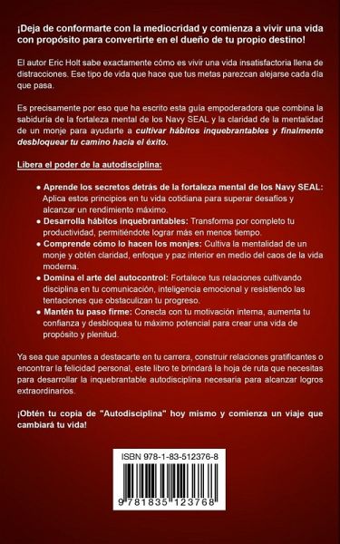 ¡Deja de conformarte con la mediocridad y comienza a vivir una vida con propósito para convertirte en el dueño de tu propio destino! El autor Eric Holt sabe exactamente cómo es vivir una vida insatisfactoria llena de distracciones. Ese tipo de vida que hace que tus metas parezcan alejarse cada día que pasa. Es precisamente por eso que ha escrito esta guía empoderadora que combina la sabiduría de la fortaleza mental de los Navy SEAL y la claridad de la mentalidad de un monje para ayudarte a cultivar hábitos inquebrantables y finalmente desbloquear tu camino hacia el éxito. Libera el poder de la autodisciplina: - Aprende los secretos detrás de la fortaleza mental de los Navy SEAL: Aplica estos principios en tu vida cotidiana para superar desafíos y alcanzar un rendimiento máximo. - Desarrolla hábitos inquebrantables: Transforma por completo tu productividad, permitiéndote lograr más en menos tiempo. - Comprende cómo lo hacen los monjes: Cultiva la mentalidad de un monje y obtén claridad, enfoque y paz interior en medio del caos de la vida moderna. - Domina el arte del autocontrol: Fortalece tus relaciones cultivando disciplina en tu comunicación, inteligencia emocional y resistiendo las tentaciones que obstaculizan tu progreso. - Mantén tu paso firme: Conecta con tu motivación interna, aumenta tu confianza y desbloquea tu máximo potencial para crear una vida de propósito y plenitud. Ya sea que apuntes a destacarte en tu carrera, construir relaciones gratificantes o encontrar la felicidad personal, este libro te brindará la hoja de ruta que necesitas para desarrollar la inquebrantable autodisciplina necesaria para alcanzar logros extraordinarios. ¡Obtén tu copia de "Autodisciplina" hoy mismo y comienza un viaje que cambiará tu vida!