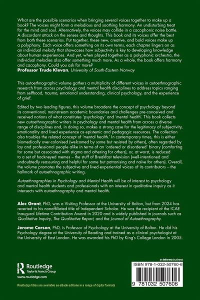 This autoethnographic volume gathers a multiplicity of different voices in autoethnographic research from across psychology and mental health disciplines to address topics ranging from selfhood, trauma, emotional understanding, clinical psychology, and the experience of grief.