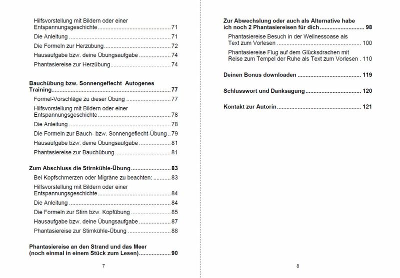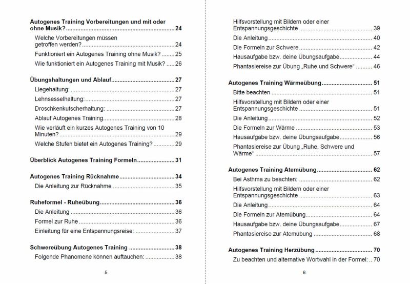Und bei allen Übungen sind auch Vorschläge mit Bildern für deine Phantasie und Unterstützung der Vorstellung mit dabei, sodass du eben leichter in die Empfindungen kommst, welche die jeweilige Formel des Autogenen Trainings bei dir erreichen will.
