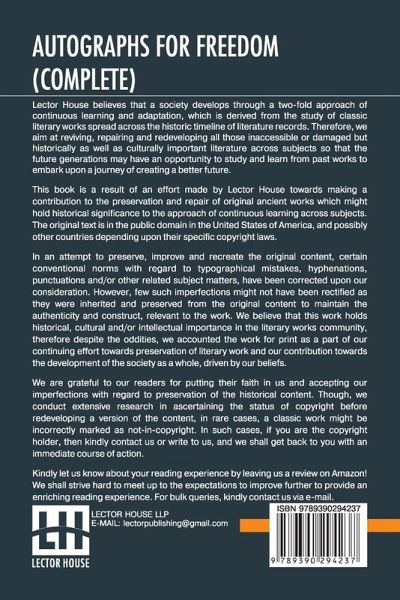 Autographs For Freedom (Complete): Edited By Julia Griffiths (Complete Edition Of Two Volumes) This book is a result of an effort made by us towards making a contribution to the preservation and repair of original classic literature. In an attempt to preserve, improve and recreate the original content, we have worked towards: 1. Type-setting & Reformatting: The complete work has been re-designed via professional layout, formatting and type-setting tools to re-create the same edition with rich typography, graphics, high quality images, and table elements, giving our readers the feel of holding a 'fresh and newly' reprinted and/or revised edition, as opposed to other scanned & printed (Optical Character Recognition - OCR) reproductions. 2. Correction of imperfections: As the work was re-created from the scratch, therefore, it was vetted to rectify certain conventional norms with regard to typographical mistakes, hyphenations, punctuations, blurred images, missing content/pages, and/or other related subject matters, upon our consideration. Every attempt was made to rectify the imperfections related to omitted constructs in the original edition via other references. However, a few of such imperfections which could not be rectified due to intentional\unintentional omission of content in the original edition, were inherited and preserved from the original work to maintain the authenticity and construct, relevant to the work. We believe that this work holds historical, cultural and/or intellectual importance in the literary works community, therefore despite the oddities, we accounted the work for print as a part of our continuing effort towards preservation of literary work and our contribution towards the development of the society as a whole, driven by our beliefs. We are grateful to our readers for putting their faith in us and accepting our imperfections with regard to preservation of the historical content. HAPPY READING!