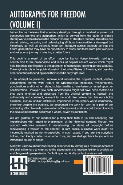 Autographs For Freedom (Volume I): Edited By Julia Griffiths (In Two Volumes - Volume I) This book is a result of an effort made by us towards making a contribution to the preservation and repair of original classic literature. In an attempt to preserve, improve and recreate the original content, we have worked towards: 1. Type-setting & Reformatting: The complete work has been re-designed via professional layout, formatting and type-setting tools to re-create the same edition with rich typography, graphics, high quality images, and table elements, giving our readers the feel of holding a 'fresh and newly' reprinted and/or revised edition, as opposed to other scanned & printed (Optical Character Recognition - OCR) reproductions. 2. Correction of imperfections: As the work was re-created from the scratch, therefore, it was vetted to rectify certain conventional norms with regard to typographical mistakes, hyphenations, punctuations, blurred images, missing content/pages, and/or other related subject matters, upon our consideration. Every attempt was made to rectify the imperfections related to omitted constructs in the original edition via other references. However, a few of such imperfections which could not be rectified due to intentional\unintentional omission of content in the original edition, were inherited and preserved from the original work to maintain the authenticity and construct, relevant to the work. We believe that this work holds historical, cultural and/or intellectual importance in the literary works community, therefore despite the oddities, we accounted the work for print as a part of our continuing effort towards preservation of literary work and our contribution towards the development of the society as a whole, driven by our beliefs. We are grateful to our readers for putting their faith in us and accepting our imperfections with regard to preservation of the historical content. HAPPY READING!