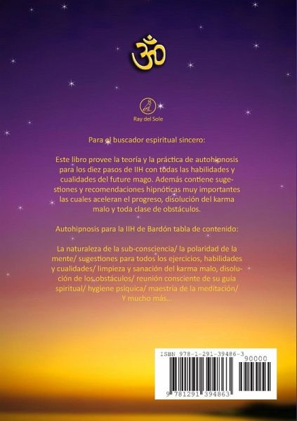 Para el buscador espiritual sincero: Este libro provee la teor'a y la pr¿ctica de autohipnosis para los diez pasos de IIH con todas las habilidades y cualidades del future mago. Adem¿s contiene sugestiones y recomendaciones hipn-ticas muy importantes las cuales aceleran el progreso, disoluci-n del karma malo y toda clase de obst¿culos. Autohipnosis para la IIH de Bard-n Ð tabla de contenido: La naturaleza de la sub-consciencia/ la polaridad de la mente/ sugestiones para todos los ejercicios, habilidades y cualidades/ limpieza y sanaci-n del karma malo, disoluci-n de los obst¿culos/ reuni-n consciente de su gu'a spiritual/ hygiene ps'quica/ maestr'a de la meditaci-n/ Y mucho m¿sÉ
