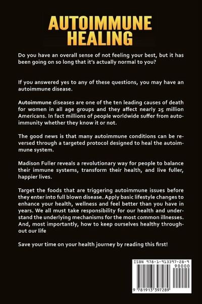 Do you have an overall sense of not feeling your best, but it has been going on so long that it’s actually normal to you? If you answered yes to any of these questions, you may have an autoimmune disease. Autoimmune diseases are one of the ten leading causes of death for women in all age groups and they affect nearly 25 million Americans. In fact, millions of people worldwide suffer from autoimmunity whether they know it or not. The good news is that many autoimmune conditions can be reversed through a targeted protocol designed to heal the autoimmune system. Dr. Madison Fuller reveals a revolutionary way for people to balance their immune systems, transform their health, and live fuller, happier lives. Target the foods that are triggering autoimmune issues before they enter into full blown disease. Apply basic lifestyle changes to enhance your health, wellness and feel better than you have in years. We all must take responsibility for our health and understand the underlying mechanisms for the most common illnesses. And, most importantly, how to keep ourselves healthy throughout our life Save your time on your health journey by reading this first!