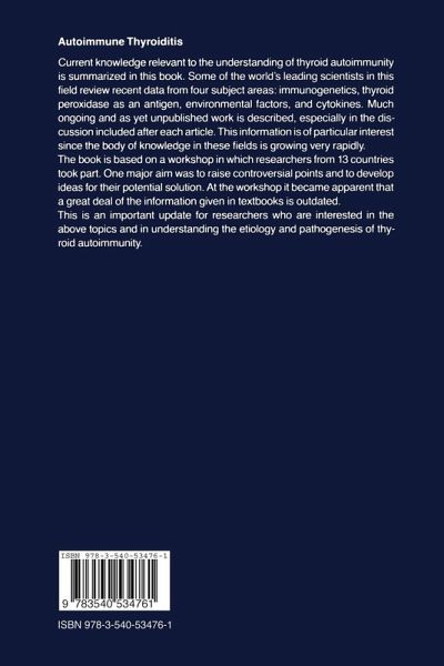Current knowledge relevant to the understanding of thyroid autoimmunity is summarized in this book. Some of the world's leading scientists in this field review recent data from four subject areas: immunogenetics, thyroid peroxidase as an antigen, environmental factors, and cytokines. Much ongoing and as yet unpublished work is described, especially in the discussion included after each article. This information is of particular interest since the body of knowledge in these fields is growing very rapidly. The book is based on a workshop in which researchers from 13 countries took part. One major aim was to raise controversial points and to develop ideas for their potential solution. At the workshop it became apparent that a great deal of the information given in textbooks is outdated. This is an important update for researchers who are interested in the above topics and in understanding the etiology and pathogenesis of thyroid autoimmunity.