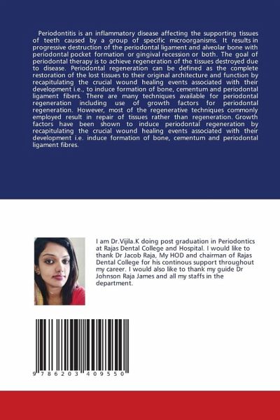 Periodontitis is an inflammatory disease affecting the supporting tissues of teeth caused by a group of specific microorganisms. It results in progressive destruction of the periodontal ligament and alveolar bone with periodontal pocket formation or gingival recession or both. The goal of periodontal therapy is to achieve regeneration of the tissues destroyed due to disease. Periodontal regeneration can be defined as the complete restoration of the lost tissues to their original architecture and function by recapitulating the crucial wound healing events associated with their development i.e., to induce formation of bone, cementum and periodontal ligament fibers. There are many techniques available for periodontal regeneration including use of growth factors for periodontal regeneration. However, most of the regenerative techniques commonly employed result in repair of tissues rather than regeneration. Growth factors have been shown to induce periodontal regeneration by recapitulating the crucial wound healing events associated with their development i.e. induce formation of bone, cementum and periodontal ligament fibres.