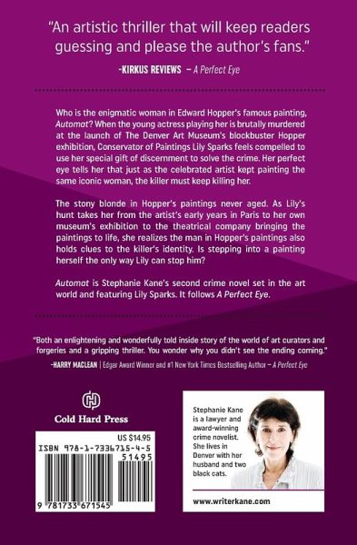 Who is the enigmatic woman in Edward Hopper's famous painting, Automat? When the young actress playing her is brutally murdered at the launch of The Denver Art Museum's blockbuster Hopper exhibition, Conservator of Paintings Lily Sparks feels compelled to use her special gift of discernment to solve the crime. Her perfect eye tells her that just as the celebrated artist kept painting the same iconic woman, the killer must keep killing her. The stony blonde in Hopper's paintings never aged. As Lily's hunt takes her from the artist's early years in Paris to her own museum's exhibition to the theatrical company bringing the paintings to life, she realizes the man in Hopper's paintings also holds clues to the killer's identity. Is stepping into a painting herself the only way Lily can stop him? Automat is Stephanie Kane's second crime novel set in the art world and featuring Lily Sparks. It follows A Perfect Eye.