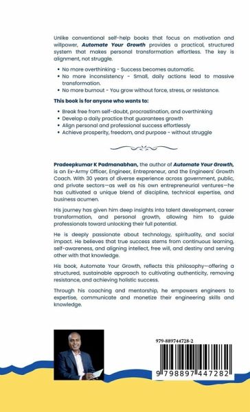 This book "Automate Your Growth" is your blueprint for unlocking unstoppable success by becoming an authentic personality. In this transformative guide, the author "Pradeepkumar K Padmanabhan" comes out with a sustainable solution to help you break free from resistance, cultivate authenticity, and achieve holistic growth in health, wealth, relationships, career, and beyond. By committing just 12 minutes a day, you'll discover your authentic personality, and it naturally develops the six core qualities-courage, clarity, consistency, capacity, consciousness, and caring-that drive true success. Rooted in timeless principles and practical action points, this book empowers you to automate your growth and create a life of prosperity, freedom, and purpose. Don't miss this opportunity to automate your journey to greatness and live the life you've always dreamed of!
