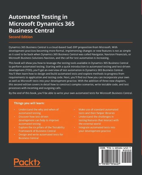 Learn how to write automated tests for Dynamics 365 Business Central and discover how you can implement them in your daily work Key Features:Leverage automated testing to advance over traditional manual testing methods Write, design, and implement automated tests Explore various testing frameworks and tools compatible with Microsoft Dynamics 365 Business Central Book Description: Dynamics 365 Business Central is a cloud-based SaaS ERP proposition from Microsoft. With development practices becoming more formal, implementing changes or new features is not as simple as it used to be back when Dynamics 365 Business Central was called Navigator, Navision Financials, or Microsoft Business Solutions-Navision, and the call for test automation is increasing. This book will show you how to leverage the testing tools available in Dynamics 365 Business Central to perform automated testing. Starting with a quick introduction to automated testing and test-driven development (TDD), you'll get an overview of test automation in Dynamics 365 Business Central. You'll then learn how to design and build automated tests and explore methods to progress from requirements to application and testing code. Next, you'll find out how you can incorporate your own as well as Microsoft tests into your development practice. With the addition of three new chapters, this second edition covers in detail how to construct complex scenarios, write testable code, and test processes with incoming and outgoing calls. By the end of this book, you'll be able to write your own automated tests for Microsoft Business Central. What You Will Learn:Understand the why and when of automated testing Discover how test-driven development can help to improve automated testing Explore the six pillars of the Testability Framework of Business Central Design and write automated tests for Business Central Make use of standard automated tests and their helper libraries Understand the challenges in testing features that interact with the external world Integrate automated tests into your development practice Who this book is for: This book is for consultants, testers, developers, and development managers working with Microsoft Dynamics 365 Business Central. Functional as well as technical development teams will find this book on automated testing techniques useful.