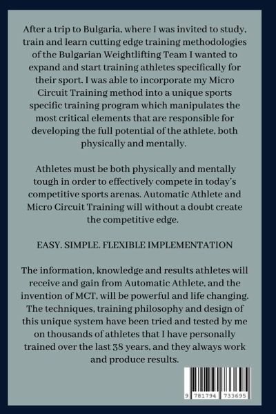 After a trip to Bulgaria, where I was invited to study, train and learn cutting edge training methodologies of the Bulgarian Weightlifting Team I wanted to expand and start training athletes specifically for their sport. I was able to incorporate my Micro Circuit Training method into a unique sports specific training program which manipulates the most critical elements that are responsible for developing the full potential of the athlete, both physically and mentally. Athletes must be both physically and mentally tough in order to effectively compete in today's competitive sports arenas. Automatic Athlete and Micro Circuit Training will without a doubt create the competitive edge. EASY. SIMPLE. FLEXIBLE IMPLEMENTATION The information, knowledge and results athletes will receive and gain from Automatic Athlete, and the invention of MCT, will be powerful and life changing. The techniques, training philosophy and design of this unique system have been tried and tested by me on thousands of athletes that I have personally trained over the last 38 years, and they always work and produce results.