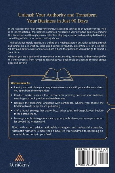 In the fast-paced world of entrepreneurship, establishing yourself as an authority in your field is no longer optional-it's essential. Automatic Authority is your definitive guide to achieving this distinction, not through years of relentless blogging or social media posting, but by doing something with far more impact: writing a book. This book is not merely a guide. It is crafted by a leading expert in authority-building through publishing. It's a marketing, sales and business revolution, presenting a clear, actionable 90-day plan both to write and also publish a book that positions you as the go-to expert in your niche. Whether you are a seasoned entrepreneur or just starting, Automatic Authority demystifies the entire process, from having no idea what your book could be about to the final printed page and beyond. Discover how to:Identify and articulate your unique voice to resonate with your audience and sets you apart from the competition. Conduct market research that uncovers the pressing needs of your audience, ensuring your book provides unbeatable value. Navigate the publishing landscape with confidence, whether you choose the traditional route or opt for self-publishing. Craft a launch strategy that creates buzz, drives sales, and catapults your book to the top of the charts. Leverage your book to generate leads, grow your business, and scale your impact far beyond the written word. Filled with expert advice, actionable strategies, and real-world examples, Automatic Authority is more than a book-it's your roadmap to becoming an undeniable authority in your field.