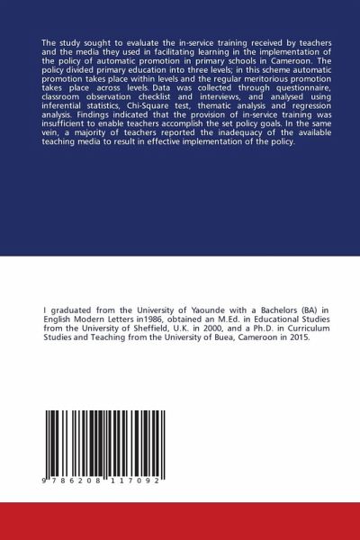 The study sought to evaluate the in-service training received by teachers and the media they used in facilitating learning in the implementation of the policy of automatic promotion in primary schools in Cameroon. The policy divided primary education into three levels; in this scheme automatic promotion takes place within levels and the regular meritorious promotion takes place across levels. Data was collected through questionnaire, classroom observation checklist and interviews, and analysed using inferential statistics, Chi-Square test, thematic analysis and regression analysis. Findings indicated that the provision of in-service training was insufficient to enable teachers accomplish the set policy goals. In the same vein, a majority of teachers reported the inadequacy of the available teaching media to result in effective implementation of the policy.
