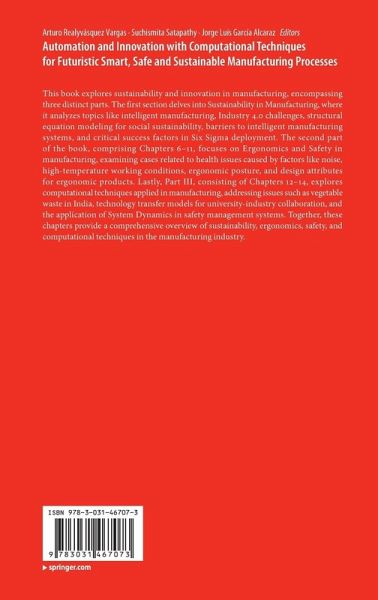This book explores sustainability and innovation in manufacturing, encompassing three distinct parts. The first section delves into Sustainability in Manufacturing, where it analyzes topics like intelligent manufacturing, Industry 4.0 challenges, structural equation modeling for social sustainability, barriers to intelligent manufacturing systems, and critical success factors in Six Sigma deployment. The second part of the book, comprising Chapters 6-11, focuses on Ergonomics and Safety in manufacturing, examining cases related to health issues caused by factors like noise, high-temperature working conditions, ergonomic posture, and design attributes for ergonomic products. Lastly, Part III, consisting of Chapters 12-14, explores computational techniques applied in manufacturing, addressing issues such as vegetable waste in India, technology transfer models for university-industry collaboration, and the application of System Dynamics in safety management systems. Together, these chapters provide a comprehensive overview of sustainability, ergonomics, safety, and computational techniques in the manufacturing industry.