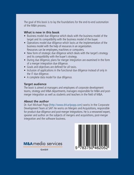 The goal of the book is end-to-end automation of M&A processes. With this book, the following tasks can be carried out: 1.Determination of the tasks to be automated: In this book, all tasks in due diligence are described. The tasks relevant for a company can be selected and then automated in a targeted manner.2.Overview of the automation options for the M&A process: The automatability described for the tasks allow an overview of which tasks in the M&A process can already be automated in which way.3.Determination of the automation potential of M&A processes: The methodology contained in this book and the details of the tasks and their automatability allow the determination of the digitization potential.4.Familiarization with M&A processes: In this book all tasks in the Due Diligence phase are documented with their objectives, a description and with questions during the execution. This enables a quick familiarization with the details of the Due Diligence phase.