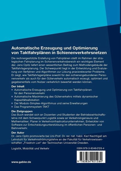 Die rechnergestützte Erstellung von Fahrplänen stellt im Rahmen der strategischen Fahrplanung im Schienenverkehrsbereich ein wichtiges Element dar. Jens Opitz liefert einen wesentlichen Beitrag zum Methodengebäude der Taktfahrlagenplanung. Der Schwerpunkt liegt in der Entwicklung und Evaluierung von Verfahren und Algorithmen zur Lösung praxisrelevanter Probleme. Er zeigt, wie Taktfahrlagenpläne sowohl für den schienengebundenen Personenverkehr als auch für den Güterverkehr automatisch erzeugt, optimiert und gegebenenfalls vom Nutzer verkehrlich bewertet werden können.