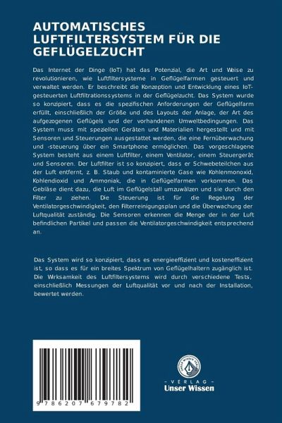 Das Internet der Dinge (IoT) hat das Potenzial, die Art und Weise zu revolutionieren, wie Luftfiltersysteme in Geflügelfarmen gesteuert und verwaltet werden. Er beschreibt die Konzeption und Entwicklung eines IoT-gesteuerten Luftfiltrationssystems in der Geflügelzucht. Das System wurde so konzipiert, dass es die spezifischen Anforderungen der Geflügelfarm erfüllt, einschließlich der Größe und des Layouts der Anlage, der Art des aufgezogenen Geflügels und der vorhandenen Umweltbedingungen. Das System muss mit speziellen Geräten und Materialien hergestellt und mit Sensoren und Steuerungen ausgestattet werden, die eine Fernüberwachung und -steuerung über ein Smartphone ermöglichen. Das vorgeschlagene System besteht aus einem Luftfilter, einem Ventilator, einem Steuergerät und Sensoren. Der Luftfilter ist so konzipiert, dass er Schwebeteilchen aus der Luft entfernt, z. B. Staub und kontaminierte Gase wie Kohlenmonoxid, Kohlendioxid und Ammoniak, die in Geflügelfarmen vorkommen. Das Gebläse dient dazu, die Luft im Geflügelstall umzuwälzen und sie durch den Filter zu ziehen. Die Steuerung ist für die Regelung der Ventilatorgeschwindigkeit, den Filterreinigungsplan und die Überwachung der Luftqualität zuständig. Die Sensoren erkennen die Menge der in der Luft befindlichen Partikel und passen die Ventilatorgeschwindigkeit entsprechend an.