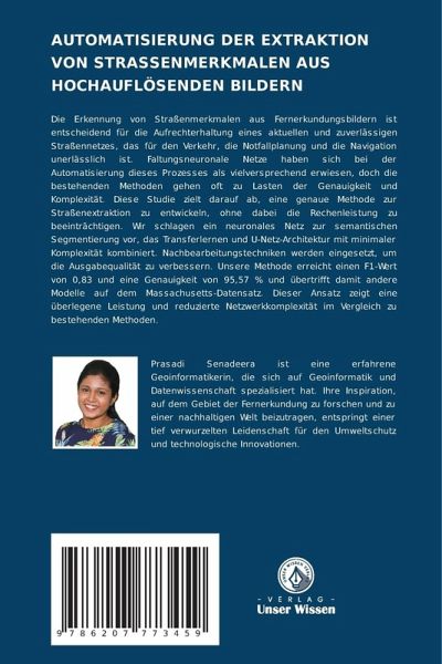 Die Erkennung von Straßenmerkmalen aus Fernerkundungsbildern ist entscheidend für die Aufrechterhaltung eines aktuellen und zuverlässigen Straßennetzes, das für den Verkehr, die Notfallplanung und die Navigation unerlässlich ist. Faltungsneuronale Netze haben sich bei der Automatisierung dieses Prozesses als vielversprechend erwiesen, doch die bestehenden Methoden gehen oft zu Lasten der Genauigkeit und Komplexität. Diese Studie zielt darauf ab, eine genaue Methode zur Straßenextraktion zu entwickeln, ohne dabei die Rechenleistung zu beeinträchtigen. Wir schlagen ein neuronales Netz zur semantischen Segmentierung vor, das Transferlernen und U-Netz-Architektur mit minimaler Komplexität kombiniert. Nachbearbeitungstechniken werden eingesetzt, um die Ausgabequalität zu verbessern. Unsere Methode erreicht einen F1-Wert von 0,83 und eine Genauigkeit von 95,57 % und übertrifft damit andere Modelle auf dem Massachusetts-Datensatz. Dieser Ansatz zeigt eine überlegene Leistung und reduzierte Netzwerkkomplexität im Vergleich zu bestehenden Methoden.