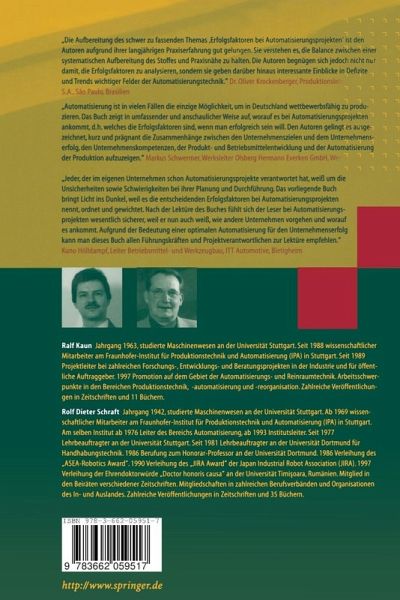 'Das Buch paßt zum "Megatrend", die Produktion weitestgehend zu automatisieren. Erstmals haben Wissenschaftler hinterfragt, welches die Geheimnisse von Unternehmen sind, die ihre Produktion erfolgreich automatisieren und warum andere Unternehmen daran scheitern. Dieses Wissen ist nicht nur für Techniker, sondern auch für Kaufleute wichtig. Die Erfolgsfaktoren wurden identifiziert und das Vorgehen bei erfolgreichen Automatisierungsprojekten anschaulich beschrieben. Die Erkenntnisse des Buches können direkt in die Praxis umgesetzt werden. Ein Buch für diejenigen, die sich mit der Planung, Finanzierung und Realisierung von Produktionsstätten befassen.