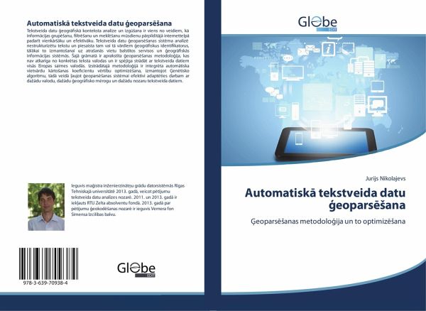Tekstveida datu eografiska konteksta analize un izgusana ir viens no veidiem, ka informacijas grup sanu, filtr sanu un mekl sanu musdienu parpilditaja internettelpa padarit vienkarsaku un efektivaku. Tekstveida datu eopars sanas sist ma analiz nestrukturiz tu tekstu un piesaista tam vai ta vardiem eografiskus identifikatorus, talakai to izmantosanai uz atrasanas vietu balstitos servisos un eografiskas informacijas sist mas. Saja gramata ir aprakstita eopars sanas metodolo ija, kas nav atkariga no konkr tas teksta valodas un ir sp jiga stradat ar tekstveida datiem visas Eiropas saimes valodas. Izstradataja metodolo ija ir integr ta automatiska vietvardu kartosanas koeficientu v rtibu optimiz sana, izmantojot en tisko algoritmu, tada veida aujot eopars sanas sist mai efektivi adapt ties darbam ar dazadu valodu, dazadu eografisko m rogu un dazadu nozaru tekstveida datiem.