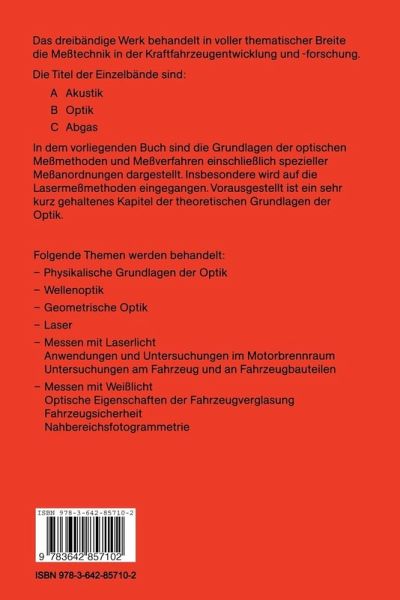 Das dreibändige Werk behandelt in voller thematischer Breite die Meßtechnik in der Kraftfahrzeugentwicklung und -forschung. Die Titel der Einzelbände sind: A Akustik B Optik C Abgas In dem vorliegenden Buch sind die Grundlagen der optischen Meßmethoden und Meßverfahren einschließlich spezieller Meßanordnungen dargestellt. Insbesondere wird auf die Lasermeßmethoden eingegangen. Vorausgestellt ist ein sehr kurz gehaltenes Kapitel der theoretischen Grundlagen der Optik. Folgende Themen werden behandelt: - Physikalische Grundlagen der Optik - Wellenoptik - Geometrische Optik - Laser - Messen mit Laserlicht Anwendungen u.Untersuchungen im Motorbrennraum Untersuchungen am Fahrzeug und an Fahrzeugbauteilen - Messen mit Weißlicht Optische Eigenschaften der Fahrzeugverglasung Fahrzeugsicherheit Nahbereichsfotogrammetrie