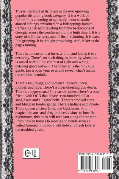 This is literature at its finest in the ever-growing popular disturbing book category. It is a work of fiction. It is a coming of age story about sexually abused siblings embarked on a kidnapping/ humantrafficking job and traveling from the backwoods of Georgia across the southwest into the high desert. It is a story of self discovery and of final reckoning. It is dark. It is gripping. It is thought-provoking. And, it keeps the pages turning. There is a monster that lurks within, and facing it is a necessity. There's no such thing as morality when one is raised without the contrast of right and wrong, defining good and evil. The monster is the only true guide. Let it open your eyes and reveal what's inside the children's minds. There's sex, drugs, and violence. There's incest, murder, and rape. There's a cross-dressing gun dealer. There's a hypersexual 10-year-old sister. There's a best friend with OCD that desires two-hundred dollar sunglasses and alligator belts. There's crooked cops and Mexican border gangs. There's Native Americans and Peyote. There's even ancient Gods and Goddesses. From magical dreams and drug induced visions to horrific nightmares, this book will take you along for the ride. From broken homes to motels and hotels across a veiled America, this book will deliver a fresh look at the troubled youth.