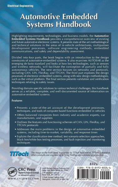 A Clear Outline of Current Methods for Designing and Implementing Automotive Systems Highlighting requirements, technologies, and business models, the Automotive Embedded Systems Handbook provides a comprehensive overview of existing and future automotive electronic systems. It presents state-of-the-art methodological and technical solutions in the areas of in-vehicle architectures, multipartner development processes, software engineering methods, embedded communications, and safety and dependability assessment. Divided into four parts, the book begins with an introduction to the design constraints of automotive-embedded systems. It also examines AUTOSAR as the emerging de facto standard and looks at how key technologies, such as sensors and wireless networks, will facilitate the conception of partially and fully autonomous vehicles. The next section focuses on networks and protocols, including CAN, LIN, FlexRay, and TTCAN. The third part explores the design processes of electronic embedded systems, along with new design methodologies, such as the virtual platform. The final section presents validation and verification techniques relating to safety issues. Providing domain-specific solutions to various technical challenges, this handbook serves as a reliable, complete, and well-documented source of information on automotive embedded systems.