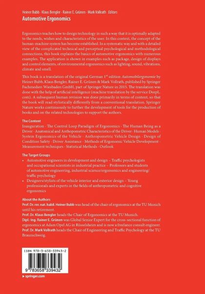 Ergonomics teaches how to design technology in such a way that it is optimally adapted to the needs, wishes and characteristics of the user. In this context, the concept of the human-machine system has become established. In a systematic way and with a detailed view of the complicated technical and perceptual psychological and methodological connections, this book explains the basics of automotive ergonomics with numerous examples. The application is shown in examples such as package, design of displays and control elements, of environmental ergonomics such as lighting, sound, vibrations, climate and smell. The design of driver assistance systems from an ergonomic perspective is also a central topic. The book is rounded off by methods of ergonomic vehicle development, the use of mock-ups, driving simulators and tests in real vehicles and prototypes. For the first time, those responsible in the automotive industry and in the field of relevant research are provided with a specializedsystematic work that provides the ergonomic findings in the design of today's automobiles. This provides planners and designers of today's automobiles with concrete information for ergonomic product development, enabling them to keep an eye on decisive requirements and subsequent customer acceptance.