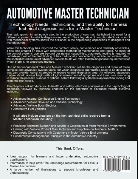 'Technology needs technicians, and the ability to harness technical diagnosis calls for a Master Technician'. The rapid growth in technology used in the production of cars has highlighted the need for a different approach to vehicle diagnosis and repair. The integration of complex electronic control with mechanical systems shows the brilliance in the engineering capabilities of designers and manufacturers. While this technology has improved the comfort, safety, convenience and reliability of vehicles, it has also created an issue with established methods of maintenance and repair. As many of the control systems operate beyond our natural capabilities, diagnostic tooling is required to undertake most of the fault finding duties traditionally conducted by vehicle technicians. Also, the sophisticated nature of advanced system faults will often lead to diagnostic requirements for which there is no prescribed method. One of the fundamental roles of a Master Technician will be the diagnosis and repair of these complex and advanced system faults, for which diagnostic approaches need to be developed that can provide logical strategies to reduce overall diagnostic time. An effective diagnostic routine should always begin with a logical assessment of symptoms and then uses reasoning to reduce the possible number of options, before following a systematic approach to finding and fixing the root cause. The chapters will introduce you to health and safety, electrical principles and the psychology of diagnosis, followed by technical chapters on the operation of advanced vehicle systems including: Advanced Internal Combustion Engine Technology Advanced Vehicle Driveline and Chassis Technology Advanced Vehicle Body Electrics Alternative Fuel Vehicles It will also include chapters on the non-technical skills required from a Master Technician including: Providing Technical Support and Advice to Colleagues in Motor Vehicle Environments Liaising with Vehicle Product Manufacturers and Suppliers on Technical Matters Diagnostic Consultations with Customers in Motor Vehicle Environments Fundamental Management Principles in the Automotive Industry This book offers: Ideal support for learners and tutors undertaking automotive qualifications. Information to help cover the knowledge requirements for Level 4 Master Technicians. A large number of illustrations to support knowledge and understanding.