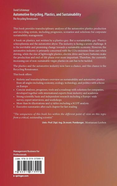 A book on plastics, not written by a plastics guy. But a sustainability guy. Plastics schizophrenia and the automotive abyss: The industry is facing a severe challenge. It is the inevitable and promising change towards a sustainable economy. However, the automotive industry is primarily concerned with the CO2 emissions from cars when driving, while the rise of lightweight plastics, electric drive and heavy batteries make the production and end-of-life phase ever more important. Therefore, the currently increasing use of non-sustainable virgin plastics in cars has to be tackled.