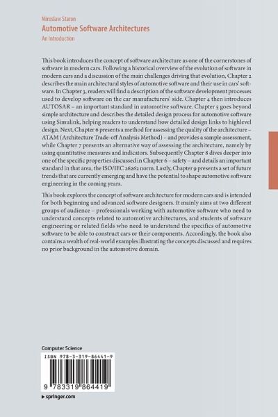 This book introduces the concept of software architecture as one of the cornerstones of software in modern cars. Following a historical overview of the evolution of software in modern cars and a discussion of the main challenges driving that evolution, Chapter 2 describes the main architectural styles of automotive software and their use in cars' software. In Chapter 3, readers will find a description of the software development processes used to develop software on the car manufacturers' side. Chapter 4 then introduces AUTOSAR - an important standard in automotive software. Chapter 5 goes beyond simple architecture and describes the detailed design process for automotive software using Simulink, helping readers to understand how detailed design links to high-level design. Next, Chapter 6 presents a method for assessing the quality of the architecture - ATAM (Architecture Trade-off Analysis Method) - and provides a sample assessment, while Chapter 7 presents an alternative way ofassessing the architecture, namely by using quantitative measures and indicators. Subsequently Chapter 8 dives deeper into one of the specific properties discussed in Chapter 6 - safety - and details an important standard in that area, the ISO/IEC 26262 norm. Lastly, Chapter 9 presents a set of future trends that are currently emerging and have the potential to shape automotive software engineering in the coming years.