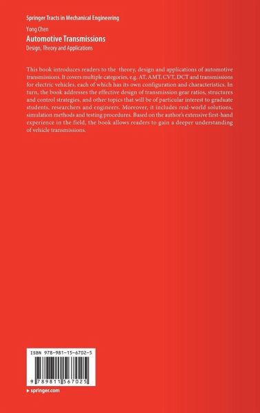 Introduction.- Manual Transmission.- Automatic Transmission.- Continuous Variable Transmission.- Dual Clutch Transmission.- Automated Manual Transmission.- New Energy Vehicle Transmission.- Transmission Design.- Transmission Oil.- Hydraulic Torque Converter Design.- Planetary gear mechanism.- Automatic Transmission Electric Control System.- Vehicle and Transmission Vibration and Noise.