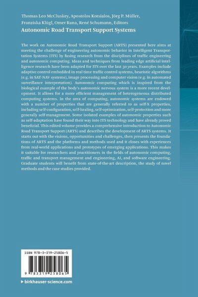 The work on Autonomic Road Transport Support (ARTS) presented here aims at meeting the challenge of engineering autonomic behavior in Intelligent Transportation Systems (ITS) by fusing research from the disciplines of traffic engineering and autonomic computing. Ideas and techniques from leading edge artificial intelligence research have been adapted for ITS over the last 30 years. Examples include adaptive control embedded in real time traffic control systems, heuristic algorithms (e.g. in SAT-NAV systems), image processing and computer vision (e.g. in automated surveillance interpretation). Autonomic computing which is inspired from the biological example of the body's autonomic nervous system is a more recent development. It allows for a more efficient management of heterogeneous distributed computing systems. In the area of computing, autonomic systems are endowed with a number of properties that are generally referred to as self-X properties, including self-configuration, self-healing, self-optimization, self-protection and more generally self-management. Some isolated examples of autonomic properties such as self-adaptation have found their way into ITS technology and have already proved beneficial. This edited volume provides a comprehensive introduction to Autonomic Road Transport Support (ARTS) and describes the development of ARTS systems. It starts out with the visions, opportunities and challenges, then presents the foundations of ARTS and the platforms and methods used and it closes with experiences from real-world applications and prototypes of emerging applications. This makes it suitable for researchers and practitioners in the fields of autonomic computing, traffic and transport management and engineering, AI, and software engineering. Graduate students will benefit from state-of-the-art description, the study of novel methods and the case studies provided.