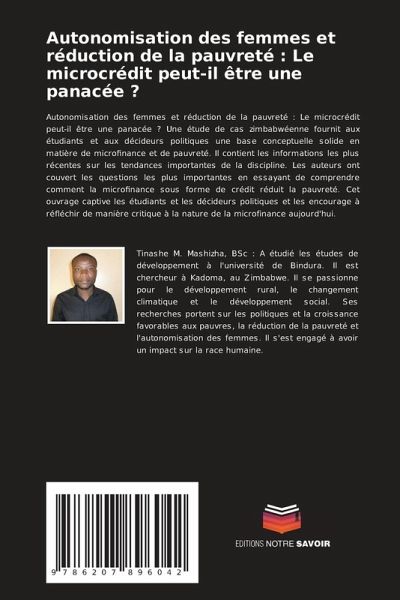 Autonomisation des femmes et réduction de la pauvreté : Le microcrédit peut-il être une panacée ? Une étude de cas zimbabwéenne fournit aux étudiants et aux décideurs politiques une base conceptuelle solide en matière de microfinance et de pauvreté. Il contient les informations les plus récentes sur les tendances importantes de la discipline. Les auteurs ont couvert les questions les plus importantes en essayant de comprendre comment la microfinance sous forme de crédit réduit la pauvreté. Cet ouvrage captive les étudiants et les décideurs politiques et les encourage à réfléchir de manière critique à la nature de la microfinance aujourd'hui.