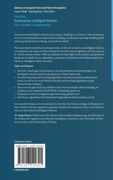 Presents a thorough introduction to the development and latest progress in intelligent vehicle research, and proposes a basic frameworkProvides detection and tracking algorithms for structured and unstructured roads, as well as on-road vehicle detection and tracking algorithms using boosted Gabor featuresDiscusses an approach for multiple sensor-based multiple-object tracking, in addition to an integrated DGPS/IMU positioning approachExamines a vehicle navigation approach using global viewsIntroduces algorithms for lateral and longitudinal vehicle motion controlAn essential reference for researchers in the field, the broad coverage of all aspects of this research will also appeal to graduate students of computer science and robotics who are interested in intelligent vehicles.