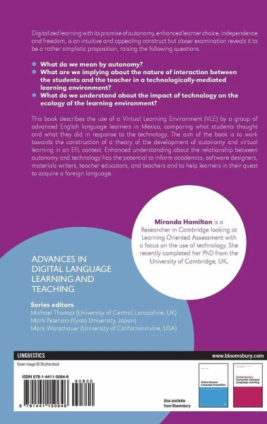 Digitalised learning with its promise of autonomy, enhanced learner choice, independence and freedom, is an intuitive and appealing construct but closer examination reveals it to be a rather simplistic proposition, raising the following questions. -What do we mean by autonomy? -What are we implying about the role of the teacher, the classroom, and interaction between learners? -What do we understand about the impact of technology on the ecology of the learning environment? This book describes the use of a Virtual Learning Environment (VLE) by a group of advanced English language learners in Mexico, comparing what students thought and what they did in response to the technology. The theoretical aim of the book is to work towards the construction of a theory of the development of autonomy and virtual learning in an EFL context. Enhanced understanding about the relationship between autonomy and technology has the potential to inform academics, software designers, materials writers, teacher educators, and teachers and to help learners in their quest to acquire a foreign language.