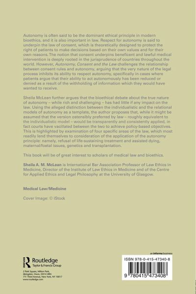 Autonomy is often said to be the dominant ethical principle in modern bioethics, and it is also important in law. Respect for autonomy is said to underpin the law of consent, which is theoretically designed to protect the right of patients to make decisions based on their own values and for their own reasons. The notion that consent underpins beneficent and lawful medical intervention is deeply rooted in the jurisprudence of countries throughout the world. However, Autonomy, Consent and the Law challenges the relationship between consent rules and autonomy, arguing that the very nature of the legal process inhibits its ability to respect autonomy, specifically in cases where patients argue that their ability to act autonomously has been reduced or denied as a result of the withholding of information which they would have wanted to receive. Sheila McLean further argues that the bioethical debate about the true nature of autonomy - while rich and challenging - has had little if any impact on the law. Using the alleged distinction between the individualistic and the relational models of autonomy as a template, the author proposes that, while it might be assumed that the version ostensibly preferred by law - roughly equivalent to the individualistic model - would be transparently and consistently applied, in fact courts have vacillated between the two to achieve policy-based objectives. This is highlighted by examination of four specific areas of the law which most readily lend themselves to consideration of the application of the autonomy principle: namely refusal of life-sustaining treatment and assisted dying, maternal/foetal issues, genetics and transplantation. This book will be of great interest to scholars of medical law and bioethics.