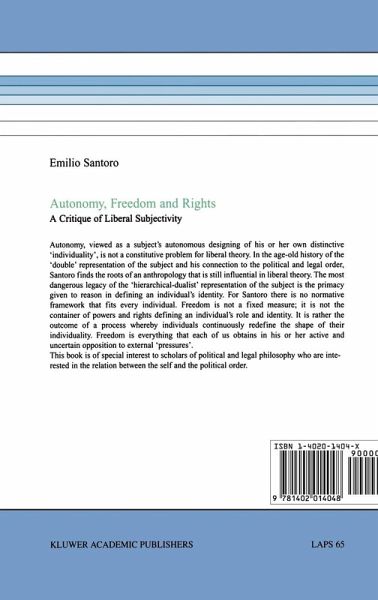 Autonomy, viewed as a subject's autonomous designing of her own distinctive 'individuality', is not a constitutive problem for liberal theory. Since its earliest formulations, liberalism has taken it for granted that protecting rights is a sufficient guarantee for the primacy of individual subjectivity. The most dangerous legacy of the 'hierarchical-dualist' representation of the subject is the primacy given to reason in defining an individual's identity. For Santoro freedom is not a fixed measure. It is not the container of powers and rights defining an individual's role and identity. It is…mehr