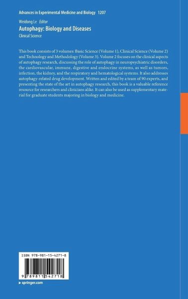 Autophagy and Alzheimer's Disease.- Autophagy and Parkinson's Disease.- Autophagy and Motor Neuron Diseases.- Autophagy and Prion Disease.- Autophagy and Lysosome Storage Disorders.- Autophagy and Mitochondrial Encephalomyopathies.- Autophagy and Ischemic Stroke.- Autophagy and Hemorrhagic Stroke.- Autophagy and Polyglutamine Disease.- Autophagy and Epilepsy.- Autophagy in Neurodevelopmental Disorders.- Autophagy and Pituitary Adenoma.- Autophagy in Schizophrenia.- Autophagy and Hypertension.- Autophagy and Myocardial Ischemia.- Autophagy and Heart Failure.- Autophagy, Myocarditis and Cardiomyopathy.- Autophagy, Hyperlipidemia and Atherosclerosis.- Application of Autophagy in Cardiovascular Diseases.- Autophagy and Tumorigenesis.- Autophagy and Tumour Stem Cells.- Autophagy and Tumour Metastasis.- Autophagy and Tumor Cell Death.- Autophagy and Tumour Chemotherapy.- Autophagy and Tumour Radiotherapy.- Autophagy and Inflammatory Diseases.- Autophagy and Immune-related Diseases.- Autophagy and Autoimmune Diseases.- Autophagy and Bacterial Infection.- Autophagy and Viral Infection.- Autophagy and Thyroid Disease.- Autophagy and Obesity and Diabetes.- Autophagy and Obesity-related Reproductive Dysfunction.- Autophagy and Acute Kidney Injury.- Autophagy and Glomerular Diseases.- Autophagy and Diabetic Nephropathy.- Autophagy and Liver Diseases.- Autophagy and Gastrointestinal Diseases.- Chronic Obstructive Pulmonary Disease and Autophagy.- Autophagy and Pulmonary Fibrosis.- Asthma and Autophagy.- Autophagy and Other respiratory diseases.- Autophagy and Leukemia.- Autophagy and Lymphoma.- Autophagy and Myeloma.- The Function and Mechanisms of Autophagy in Traumatic Brain Injury.- The Function and Mechanisms of Autophagy in Spinal Cord Injury.- The Function and Mechanisms of Autophagy in Trauma of Other Parts of the Body.- The Prospects of Therapeutic Potential and Drug Development Targeting Autophagy in Cancer.- Progress of Anti-aging Drugs Targeting Autophagy.- Drug Development and Treatment of Autophagy in Other Diseases.- Systems Biology Approaches in Autophagy Research.- Natural Product Regulates Autophagy in Cancer.- Regulation of Autophagy in Neurodegenerative Diseases by Natural Products.- Regulation of Autophagy in Cardiovascular Diseases by Natural Products.