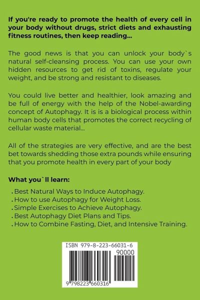 Do you want to look beautiful, fill your body with energy and get rid of a few extra pounds permanently? Would you like to eliminate toxins, stop the aging process and live longer in good health and shape? If you're ready to promote the health of every cell in your body without drugs, strict diets and exhausting fitness routines, then keep reading... The good news is that you can unlock your body`s natural self-cleansing process. You can use your own hidden resources to get rid of toxins, regulate your weight ,and be strong and resistant to diseases. You could live better and healthier, look amazing and be full of energy with the help of the Nobel-awarding concept of Autophagy. It is is a biological process within human body cells that promotes the correct recycling of cellular waste material... Every person is different, and this is why this guide has put together four different methods of achieving autophagy, with the desire to provide alternatives and ensure that everyone is covered. All of the strategies are very effective, medically approved, and are the best bet towards shedding those extra pounds while ensuring that you promote health in every part of your body What you`ll learn:Best Natural Ways to Induce Autophagy. How to use Autophagy for Weight Loss. Simple Training and Exercises to Achieve Autophagy. Best Autophagy Diet Plans and Tips. How to Combine Fasting, Diet, and Intensive Training. Powerful Strategies to Maintain Autophagy. Secrets of Safe Water Fasting. Foods that Help to Induce Autophagy. How to Avoid Starvation while Fasting. This manual is for everyone who wants better health now and in the future. It is for all who want to look good, to have a strong immune system and protection from diseases. It is your anti-aging guide to a long, healthy life, in great physical and mental shape. Even if you haven`t got the significant results through popular dieting, you can achieve success with the help of this complete manual.