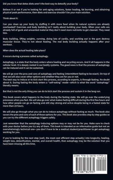 Did you know that detox diets aren't the best way to detoxify your body? Believe it or not if you're looking for anti-aging solutions, faster healing, fat burning, and obtaining physical peak performance, then diets and exercise shouldn't be your main solution. Think about it. Can you clean up your body by stuffing it with more food when its natural systems are already overloaded? Exercises and body building isn't really about building your body. When your cells are already full of gunk and unwanted material they don't need more nutrients to get cleaned. They need less. Body building, lifting weights, running, doing lots of cardio, and working out in the gym destroy muscular tissue. They're not about healing. The real body building actually happens after your workout. When does the actual healing take place? It occurs during a process called autophagy. Autophagy is a state that the body enters where healing and recycling occurs. And it all happens in the cellular level. It is deeply rooted in our bodily systems. The good news is that the process of autophagy can be induced and it can be sustained. We will go over the pros and cons of autophagy and fasting (intermittent fasting to be exact). On top of that we will also cover other options and whether they are for you or not. The best way to induce or to kick start this process, according to experts, is through fasting. No doubt about it. During fasting the body enters a "self-eating" mode-which is what the word "autophagy" literally means. But that is not the only thing you can do to kick start the process and sustain it in the long run. This book covers what happens to the body during the fasting state. We will go over the underlying processes when you fast. We will also go over what makes fasting difficult during the first few hours and how other people can go on fasting and still stay strong and active despite being in a fasted state for more than 24 hours. We will also go through what you can do to induce autophagy without fasting as much. The book also covers the pros and cons of each of these options for you. This book also provides step by step guides so you can try the different autophagy triggers safely. Just remember that the autophagy inducing options may or may not be for you. Make sure to check with your doctor before you try any of them. This book is intended as an informative guide but not an overwhelmingly technical one-you don't have to be a medical student/practitioner to get autophagy working for you. If you're looking for the next step (well, the most cost efficient step actually) into longevity, healing, weight loss, detoxification, mental, and overall health, then autophagy may be the solution that you have been missing all this time. So scroll up, click "Buy Now" and let the information you find in this book help you to improve your health and overall well-being!