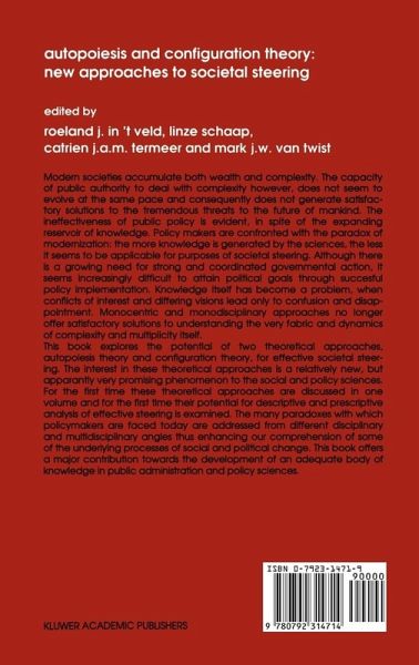 I Introduction.- 1. Autopoiesis, configuration and steering: impossibility theorem or dynamic steering theory.- 2. Introduction to configuration approach: a process theory for societal steering.- 3. Introduction to autopoiesis theory and autopoietic steering.- II Configuration Theory.- 4. Some notions on social integration and steering.- 5. Offering new possibilities of organizing in social situations: towards a posture of decentering and centering.- 6. Managing of social cognitive configurations in a multiple context.- 7. Knowledge, reification and organization; some critical comments.- 8. The feasibility of developing a political steering theory based on process-oriented configuration theories.- 9. Effective policy making in a multi-actor setting: networks and steering.- 10. Consistency, configuration, closure and change.- III. Autopoiesis Theory.- 11. Autopoieses and steering: how politics profit from the normative surplus of capital.- 12. Environmental mediation: an example of applied autopoiesis?.- 13. Autopoiesis and steering: the role of identity.- 14. Policy instruments for steering autopoietic actors.- 15. Autopoiesis, learning and governmental steering.- 16. Communication and steering: what the science of public administration could learn from Habermas and Luhmann.- 17. Applicability of autopoiesis to administration science.- 18. Simulation: learning environments for (self-)steering in social systems.- IV. Conference Impressions.- 19. A stranger in paradise? Autopoiesis, configuration and societal steering.- Authors Index.- About the Authors.