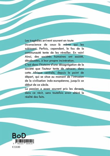 Les tragédies arrivent souvent en toute inconscience de ceux-là même qui les subissent. Parfois, cependant, le fou de la communauté tente de les réveiller. En vain! Ainsi, des sociétés humaines ont assisté, désabusées, à leur propre incinération.C'est donc l'histoire d'une désagrégation de la société que l'auteur tente de retracer, dans cette Afrique centrale, depuis le point de départ, qui se situe au moment de l'intrusion de la civilisation indo-européenne, jusqu'à ce début de ce siècle. La passion a assez souvent pris les devants dans ce récit, sans toutefois avoir altéré la réalité des faits.