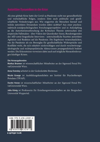 Als eine globale Krise hatte die Covid-19-Pandemie nicht nur gesundheitliche und wirtschaftliche Folgen, sondern löste auch politische und gesellschaftliche Veränderungen aus. Wie reagierten die Menschen hierauf und welche autoritären Dynamiken wurden dabei sichtbar? Aus einer psychoanalytisch-sozialpsychologischen Forschungsperspektive und in Anknüpfung an die Autoritarismusforschung der Kritischen Theorie untersuchen drei empirische Fallstudien - über Videos der Querdenker-Szene, Bundestagsreden der AfD sowie biografische Interviews - unterschiedliche Facetten autoritärer Agitation und Reaktion auf die Pandemie. Die Ergebnisse veranschaulichen, wie die Pandemie als ein Brennglas für gesellschaftliche Widersprüche und Konflikte wirkt, die sich subjektiv niederschlagen und durch verschwörungsideologische und rechtspopulistische Akteur:innen propagandistisch bedient werden. Die Erkenntnisse verweisen dabei auch auf mögliche Herausforderungen künftiger Krisen.