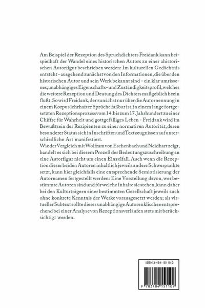 Ähnliche Prozesse der Konstruktion eines Autorprofils im kulturellen Gedächtnis lassen sich vergleichend bei der Rezeption Wolframs von Eschenbach und Neidharts feststellen. Auch hier existieren Autorenbilder, die den Rezipienten der Werke bekannt waren und die spätere Deutung beeinflusst haben.