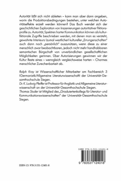 Einführung.- Autorität. Geschichtliche Performanz und kulturelle Fiktionalität.- Autorität und Geschichte.- Autorität in traditionalen Gesellschaften. Das Beispiel Rom.- Christliche Autorität im Mittelalter aus kirchenrechtlicher Sicht.- Autorität der Brutalität - Brutalität der Autorität. Folterpraktiken und Hinrichtungsrituale in der frühen Neuzeit.- Gegenwartsschrumpfung. Traditionsgeltungsschwund und avantgardistische Autorität.- Autorität ohne Hegemonie. Soziokulturelle Autoritätsformen im 20. Jahrhundert.- Autorität der Kontingenz. Zu einem Problem der Steuerung komplexer Sozialsysteme.- Autorität und Vermittlung.- Literatur und Literaturwissenschaft - Offenheit und Autorität.- Anti-Autorität bei dem jungen Zola - zwischen Revolte und Reklame.- Autoritätsproblematik im Bezugsfeld von 'Eigen' und 'Fremd'. Zur Mentalitätsgeschichte der Moderne.- softwar / hardwar. Technologische Rationalität und der 'Sprachmantel Gottes'.- Autoritätsmaschinen - Bewußtseinsmaschinen.- Autorität und Person.- Hermeneutik und Autorität - eine Bilanz.- Staatliche Autorität contra personale Identität. Zu einer fatalen Dialektik in der Geschichte des osteuropäischen Sozialismus.- Das Problem der 'Stärke': Eine nur scheinbar individualpsychologische Kategorie.- Tautologien und Paradoxien in der Kommunikation. Zur Anthropologie des Restes.- 'Weichheit' und 'Härte' psychotherapeutischer Kommunikation. Das Ende der Profession zur / der Psyche?.- Ehescheidung. Ersetzung familiärer Autorität durch juristische Macht?.- Hinweise zu den Autorinnen und Autoren.