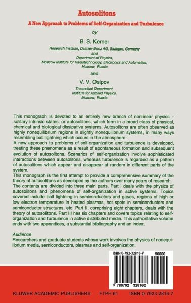 This monograph is devoted to an entirely new branch of nonlinear physics - solitary intrinsic states, or autosolitons, which form in a broad class of physical, chemical and biological dissipative systems. Autosolitons are often observed as highly nonequilibrium regions in slightly nonequilibrium systems, in many ways resembling ball lightning which occurs in the atmosphere. We develop a new approach to problems of self-organization and turbulence, treating these phenomena as a result of spontaneous formation and subsequent evolution of autosolitons. Scenarios of self-organization involve sophisticated interactions between autosolitons, whereas turbulence is regarded as a pattern of autosolitons which appear and disappear at random in different parts of the system. This monograph is the first attempt to provide a comprehensive summary of the theory of autosolitons as developed by the authors over the years of research. The monograph is comprised of three more or less autonomous parts. Part I deals with the physical nature and experimental studies of autosolitons and self organization in various physical systems: semiconductor and gas plasma, heated gas mixture, semiconductor structures, composite superconductors, optical and magnetic media, systems with uniformly generated combustion matter, distributed gas-discharge and electronic systems. We discuss feasibility of autosolitons in the form of highly nonequilibrium regions in slightly nonequilibrium gases and semiconductors, "hot" and "cold" regions in semiconductor and gas plasmas, static, pulsating and traveling combustion fronts.